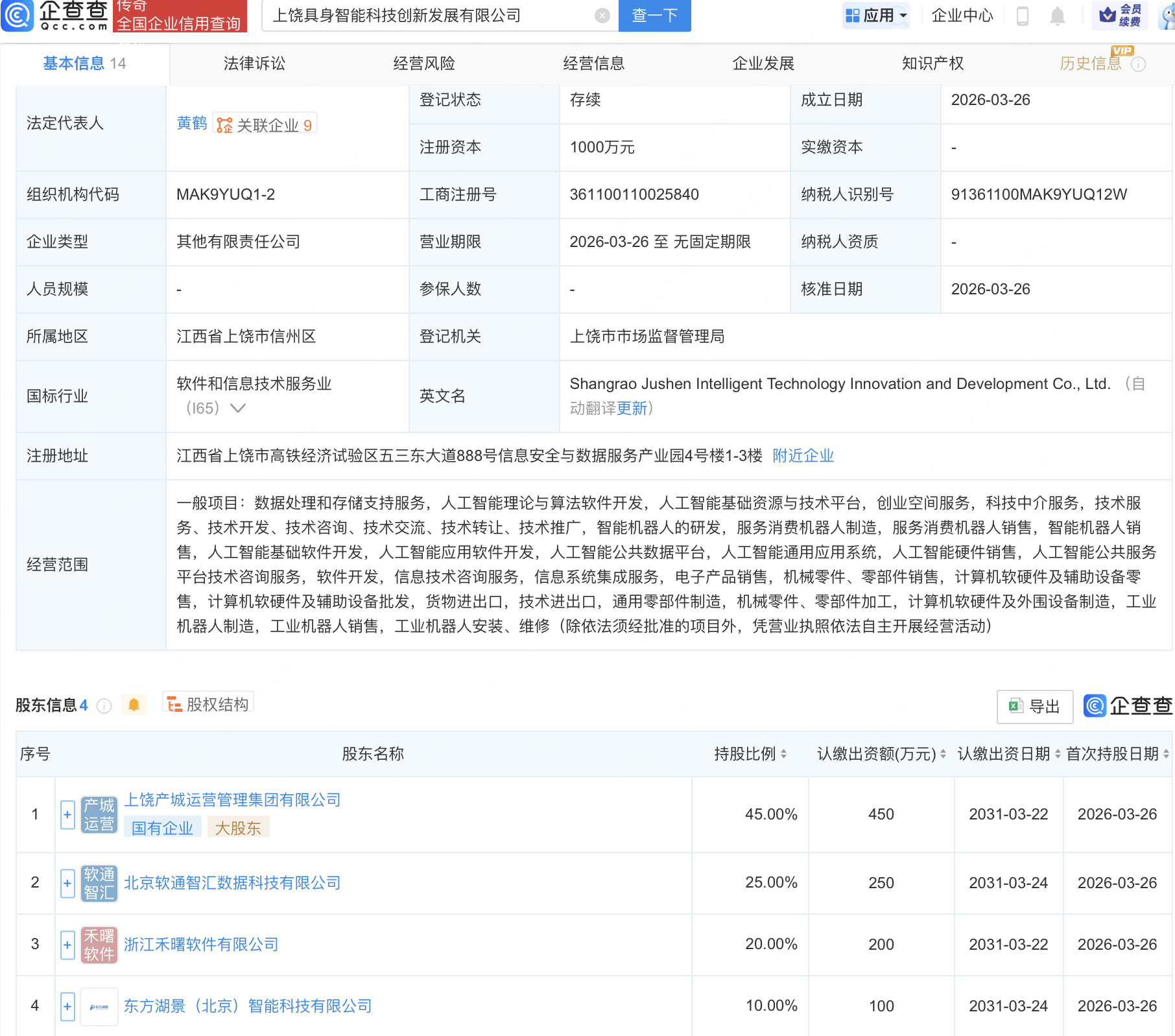 近日,上饶具身智能科技创新发展有限公司成立,经营范围包含:人工智能理论与算法软件开发,人工智能基础资源与技术平台,智能机器人的研发,服务消费机器人制造等。企查查股权穿透显示,该公司由上饶产城运营管理集团有限公司等共同持股。